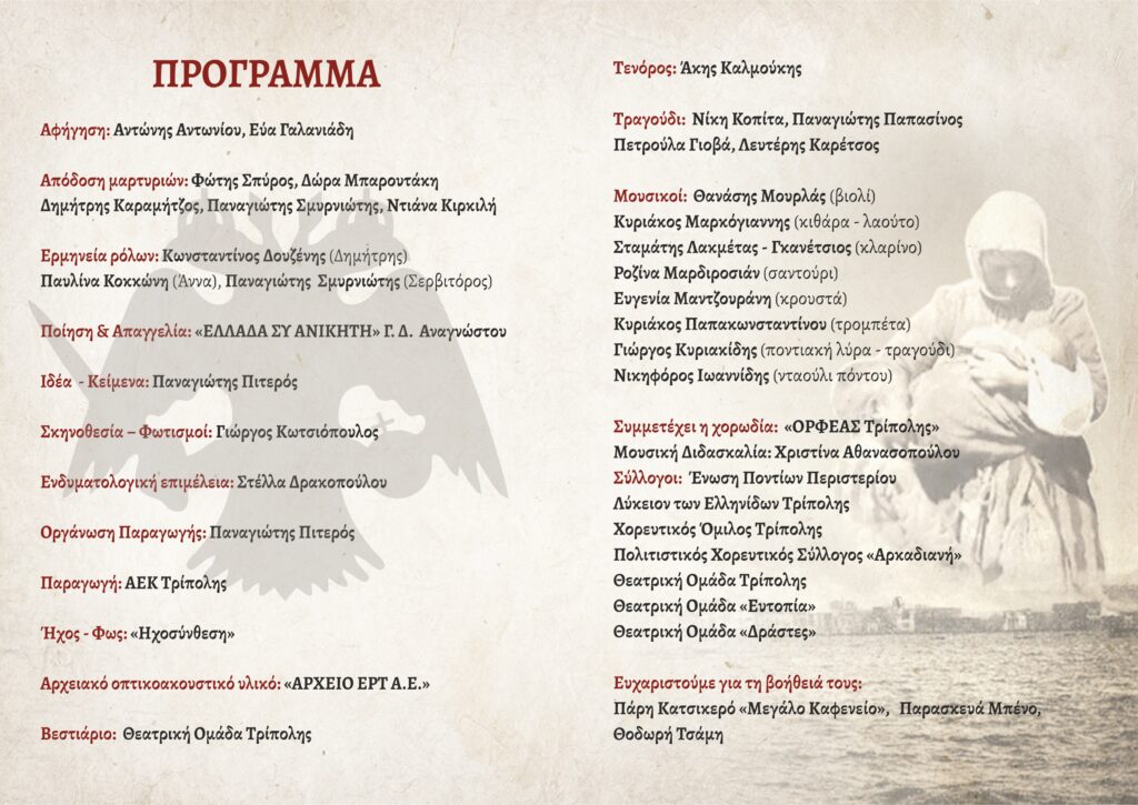 Η παράσταση είναι αφιερωμένη στη Μικρασιατική Μνήμη, τελεί Υπό την αιγίδα του ΔΗΜΟΥ ΤΡΙΠΟΛΗΣ και παρουσιάζει: